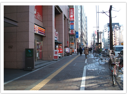 地上へ出たら左の三角屋根の交番の方へ進みます。