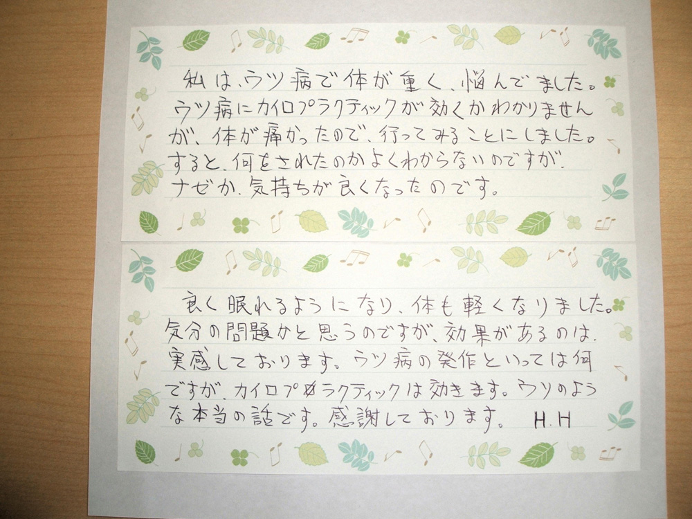 ウツ病の発作といっては何ですが、カイロプラクティックは効きます。