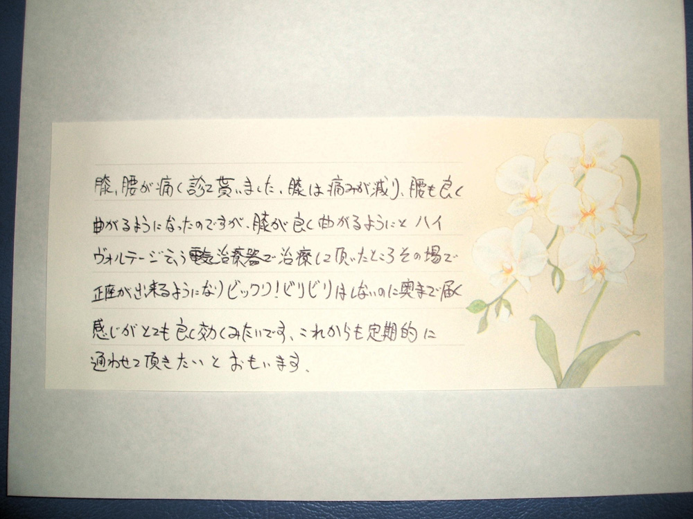 膝は痛みが減り、腰も良く曲がるようになったのですが、膝が良く曲がるようにとハイヴォルテージ云う電気治療器で治療して頂いたところその場で正座が出来るようになりビックリ!